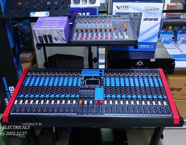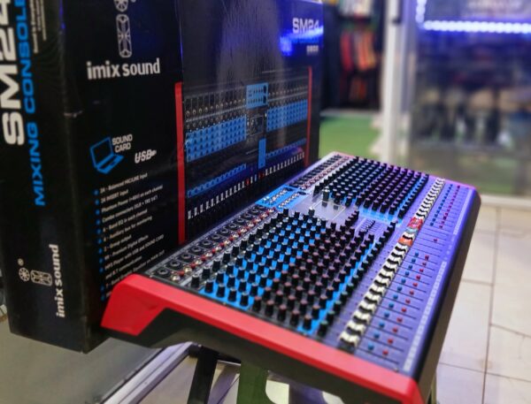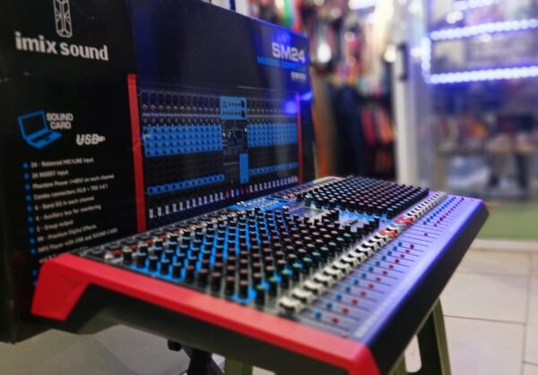 The Imix SM24 is a 24-channel analog mixer featuring a USB interface and built-in effects. It provides a total of 24 channels, includes phantom power, and can be used for live events or studio work, offering a robust and versatile solution for audio control.